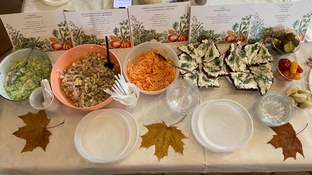 Potrawy przygotowane przez członków organizacji były różne i smaczne: szarlotki, naleśniki, konfitury z rajskich jabłek, krakowski sernik z jagodami, sałatki, ruloniki, ciasteczka i wiele innych pyszności. Niech taki bogaty stół będzie u wszystkich!