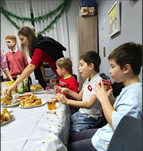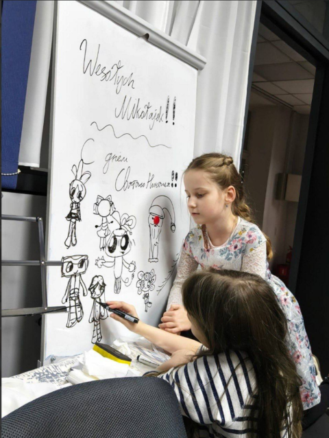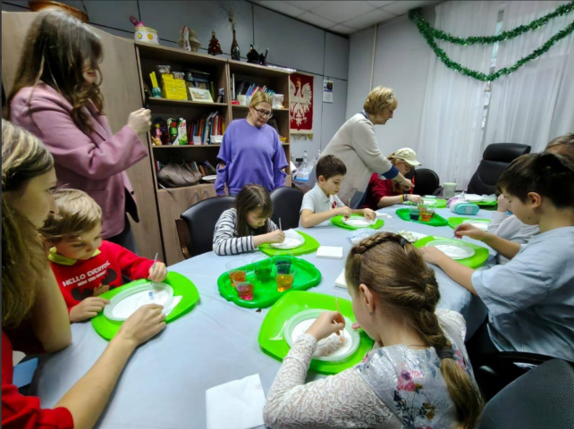 Tego samego dnia dzieci polonijne wzięły udział w przygotowanym przez „Dom Polski” mikołajkowym programie świątecznym, który był pełen ciekawych opowieści, muzyki, odkryć i radości. Nikita Frołow, Małgorzata Pocienkowska i Dymitr Paprocki w fascynującej, interaktywnej formie opowiedzieli o tajemnicach życia Św. Mikołaja i o tradycjach świątecznych, a potem wspólnie z dziećmi uczyli się kolęd i śpiewali je razem. Następnie dzieci wzięły udział w „Magicznym Laboratorium", gdzie działy się prawdziwe cuda! Pod bacznym okiem Olgi Obernichiny dzieciaki obserwowały niezwykłe zjawiska od iskrzących się świątecznych światełek i śnieżnej „zamieci" na stole aż po bąbelkowe „zaspy” i kolorowe „lodowe obrazy". Dzieci zrobiły bombki, które ozdobią świąteczne drzewka w ich domach. Po twórczych odkryciach dzieci spędziły czas z Marią Nazarową: był to czas aktywnych gier i konkursów, podczas których dzieciaki naładowały się energią i otrzymały nagrody. Święto zakończyło się wspólnym piciem herbaty i wręczeniem prezentów.
